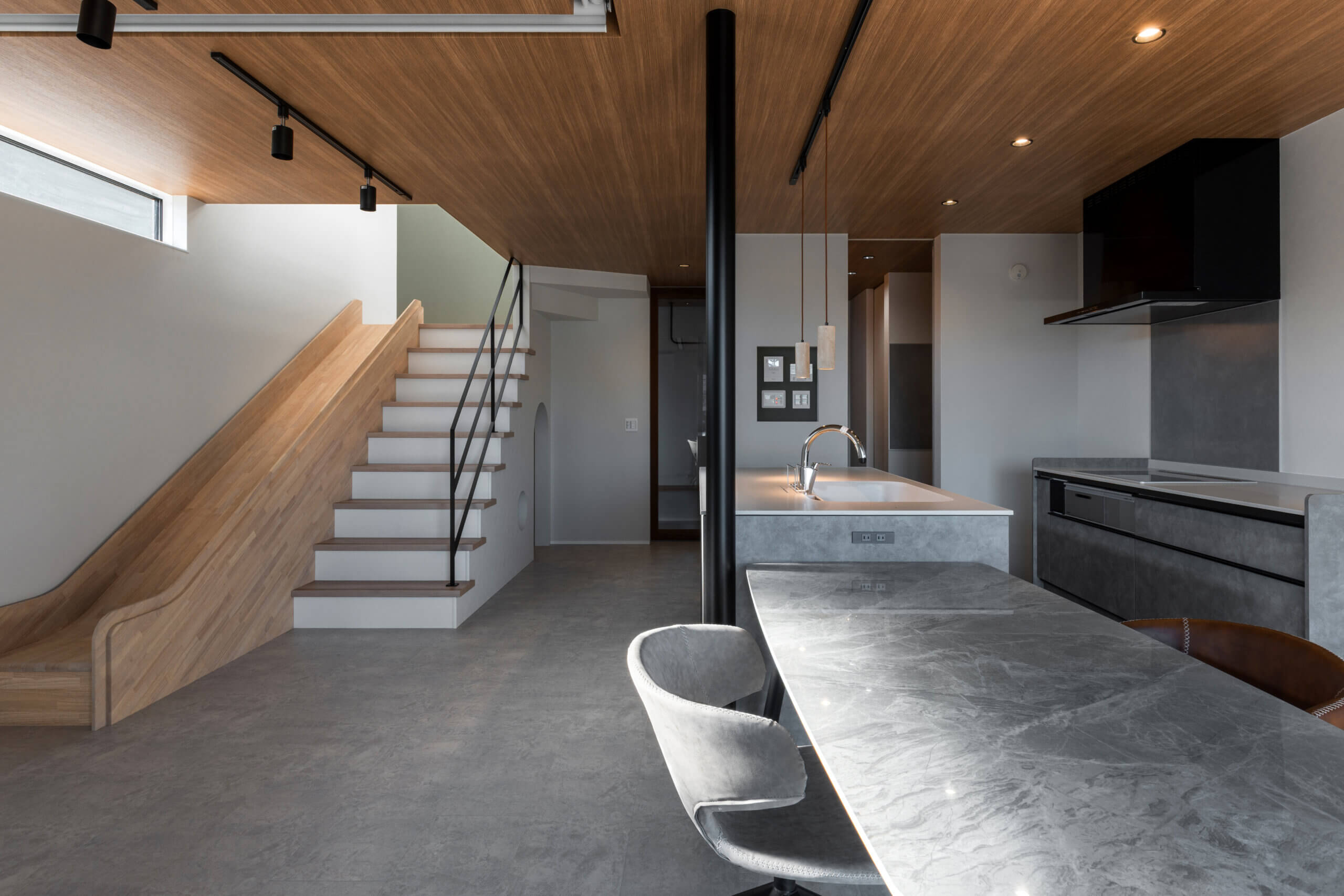 グレーを基調とした落ち着きある空間に、ご夫婦の夢だったすべり台を取り入れた住まい。限られた条件の中で、デザイン性と機能性の両立を追求しました。裏庭には愛犬のためのドッグランを設け、玄関からそのまま足を洗える動線も確保。