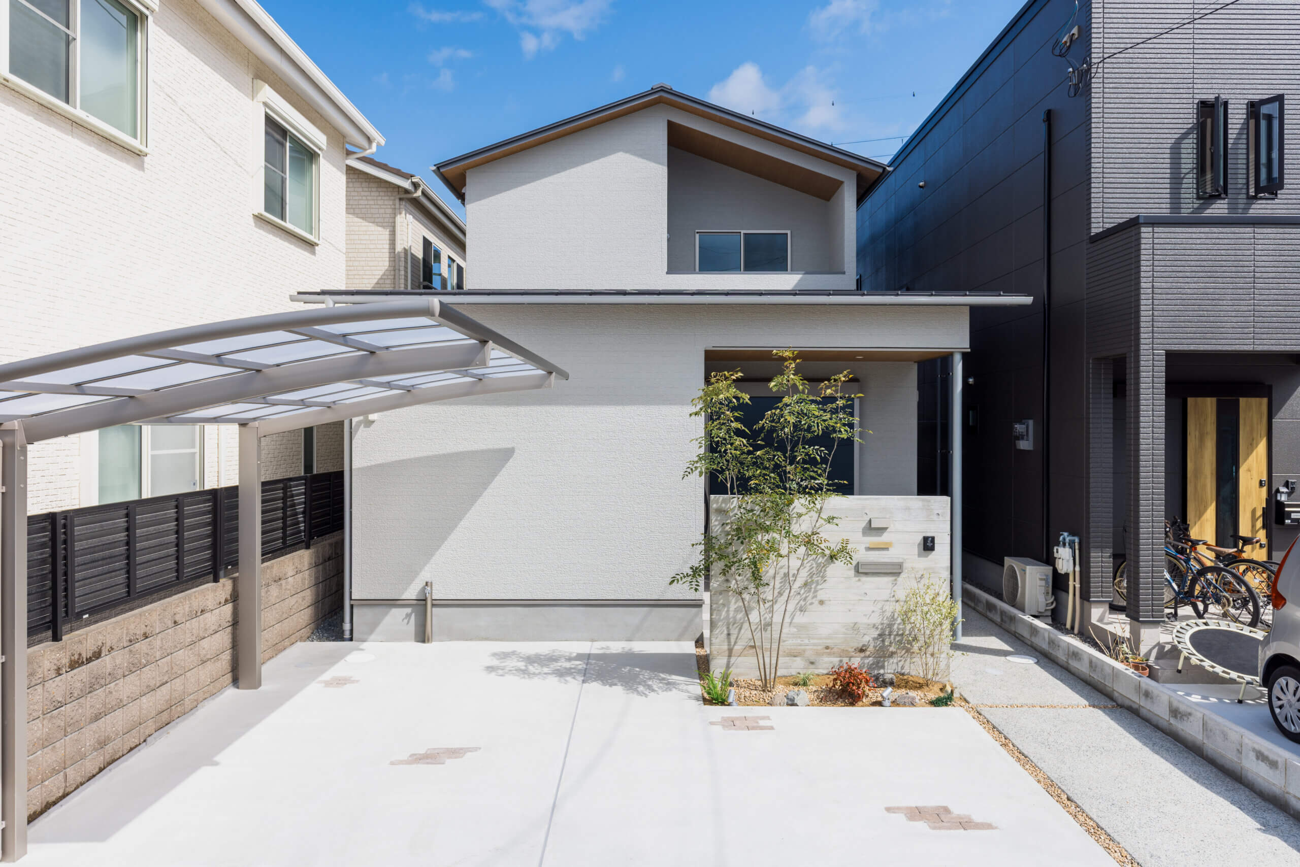 切妻屋根にグレーの外観が和モダンな印象。2階のバルコニーは屋根の勾配に沿って開口を設けることで抜け感をプラス。シンプルなデザインの鉄柱を添えることで外観全体を洗練された印象に引き締めています。